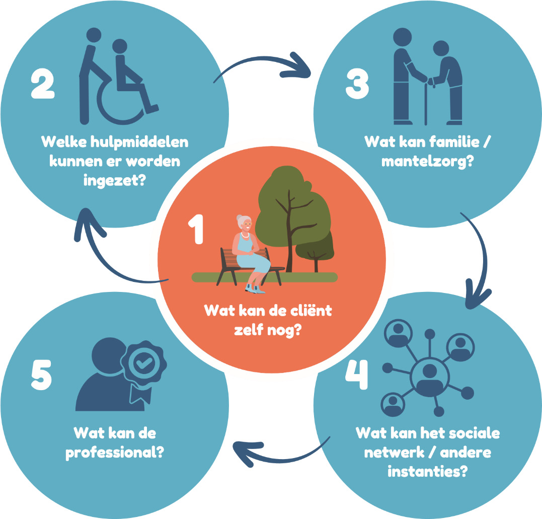 Deze nieuwe versie van Mikzo brengt meer structuur en wetenschappelijke onderbouwing. En dat is nodig, want volgens Susan en Frank kan echte behoeftegestuurde zorg alleen ontstaan als organisaties werken vanuit hetzelfde vertrekpunt. “We willen op basis van waardes en data gaan adviseren”, legt Frank uit. “Wat kan de cliënt zelf? Wat kan de mantelzorger doen? Wat de vrijwilliger? En wat blijft er over voor de zorgprofessional?” Die denkwijze is gevangen in wat zij de ‘Schijf van 5’ noemen. Een systematiek die integraal kijkt naar de rolverdeling van het zorgproces.